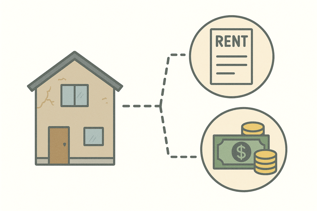 賃貸収入を得ながら、将来的な売却のタイミングを待つことができますし、賃貸中の物件でも収益物件として投資家に売却できる可能性もあります。ただし、賃貸に出すには最低限の設備修繕が必要であり、空室リスクや管理の手間も考慮する必要があります。