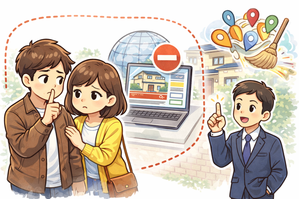 さらに、物件の特徴を説明する際も、「○○小学校から徒歩5分」といった具体的な情報ではなく、「閑静な住宅街」といった一般的な表現にとどめることで、地域の人が見ても自分の近隣物件だと気づきにくくなります。