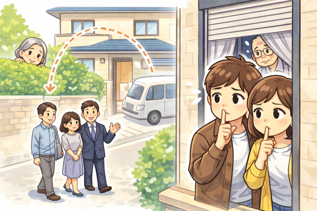 購入希望者による内見は避けられませんが、そのタイミングを工夫することで、近隣住民に気づかれるリスクを減らすことができます。