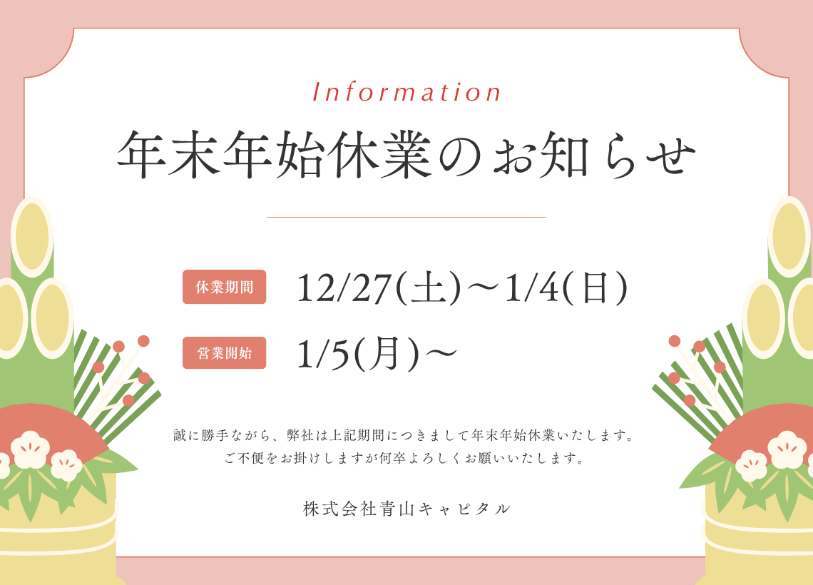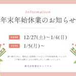 本年も残り僅かとなりました。皆様には格別のご愛顧を賜り厚く御礼申し上げます。来年も皆様にとって良い年でありますようお祈り申し上げます。 さて、当社の年末年始の休業期間は下記の通りとさせ...
